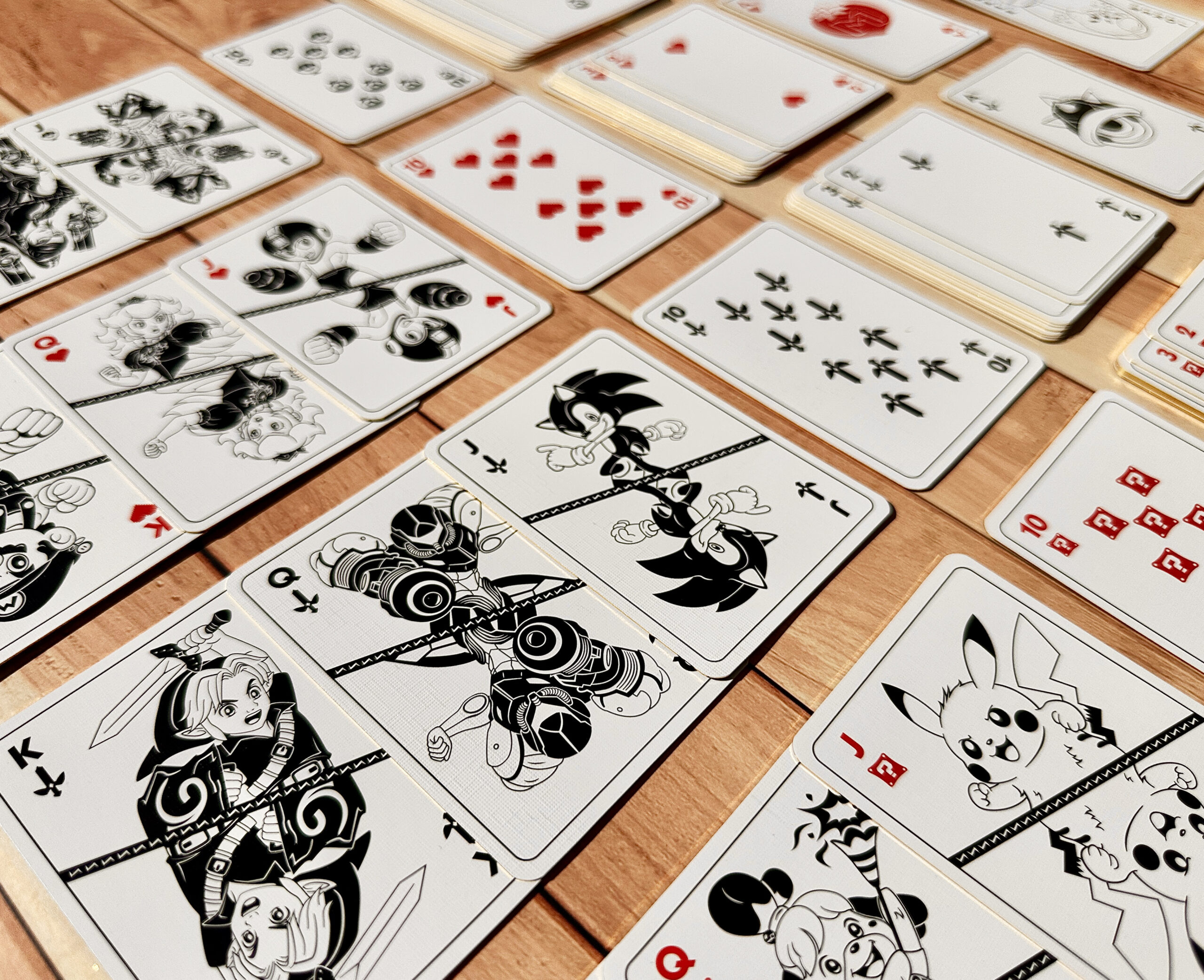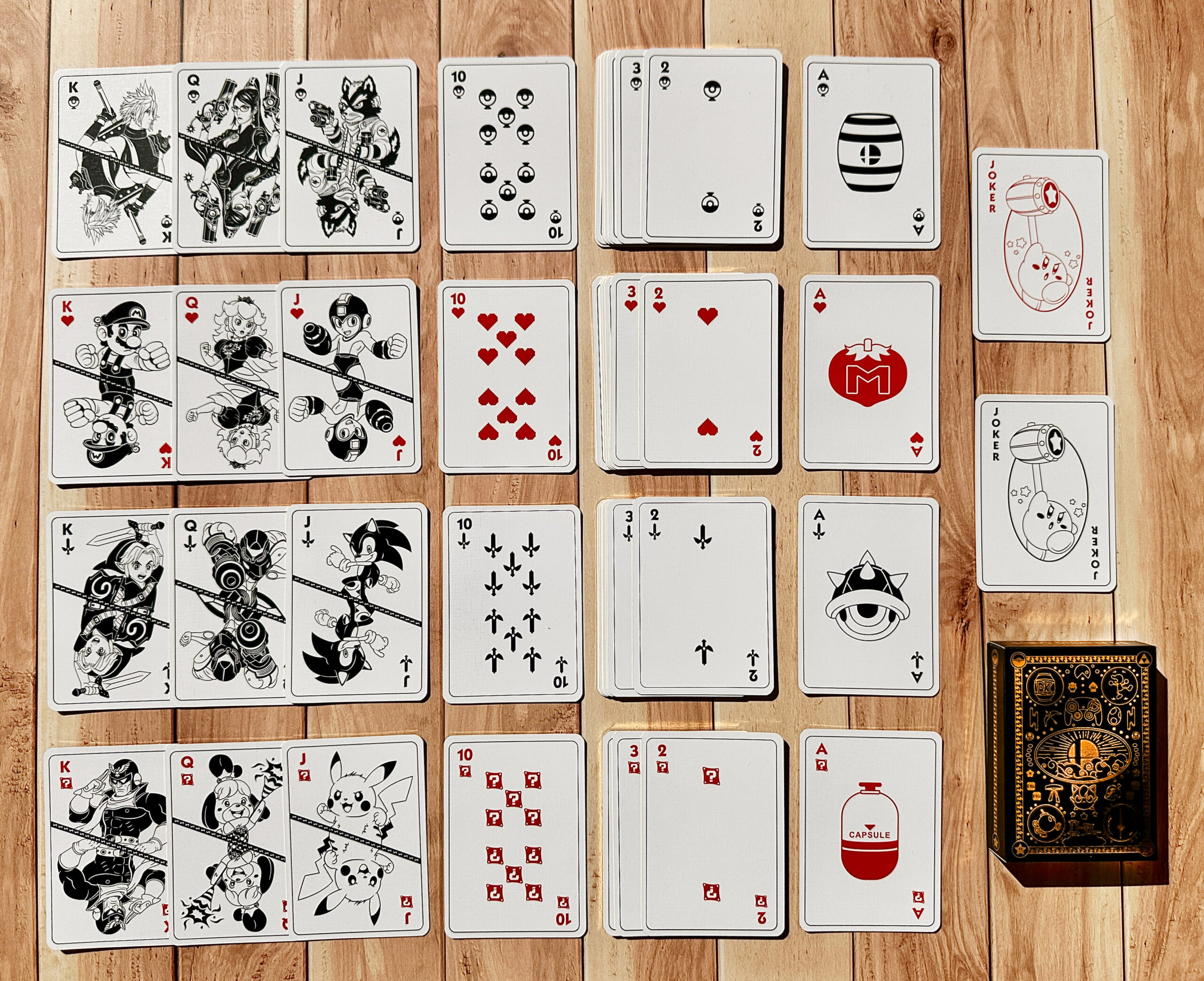 Les cartes reprennent l’univers des jeux super Smash Bros avec les personnages les plus emblématiques (Mario, Link, Sonic, Pikachu, Peach, Samus Aran, Kirby…), les traditionnelles coeur, pique, trèfle et carreaux sont personnalisés pour être également dans l’univers des jeux.